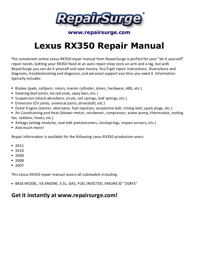 View and Download Lexus RX 350 service manual online. RX 350 Automobile pdf manual download. Also for: Rx 450h.